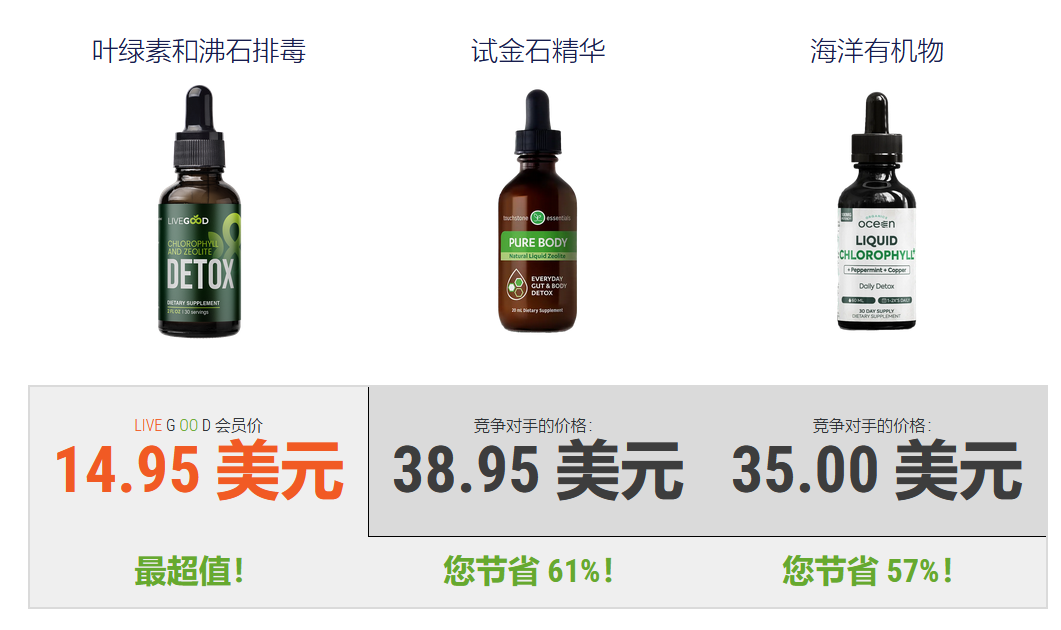 毒素已成为对我们健康的最危险威胁之一!它们无处不在——在我们的食物、饮料中,甚至在我们呼吸的空气中。每当我们吃非有机食品、喝自来水或呼吸污染的空气时,毒素就会在我们体内积聚。这种毒素的积累会导致加速衰老、免疫系统减弱,以及更容易生病、患病甚至癌症。但使用 LiveGood 的叶绿素和沸石排毒,您可以自然地清洁细胞并恢复健康。??? LiveGood 叶绿素和沸石排毒产品如何消除毒素?